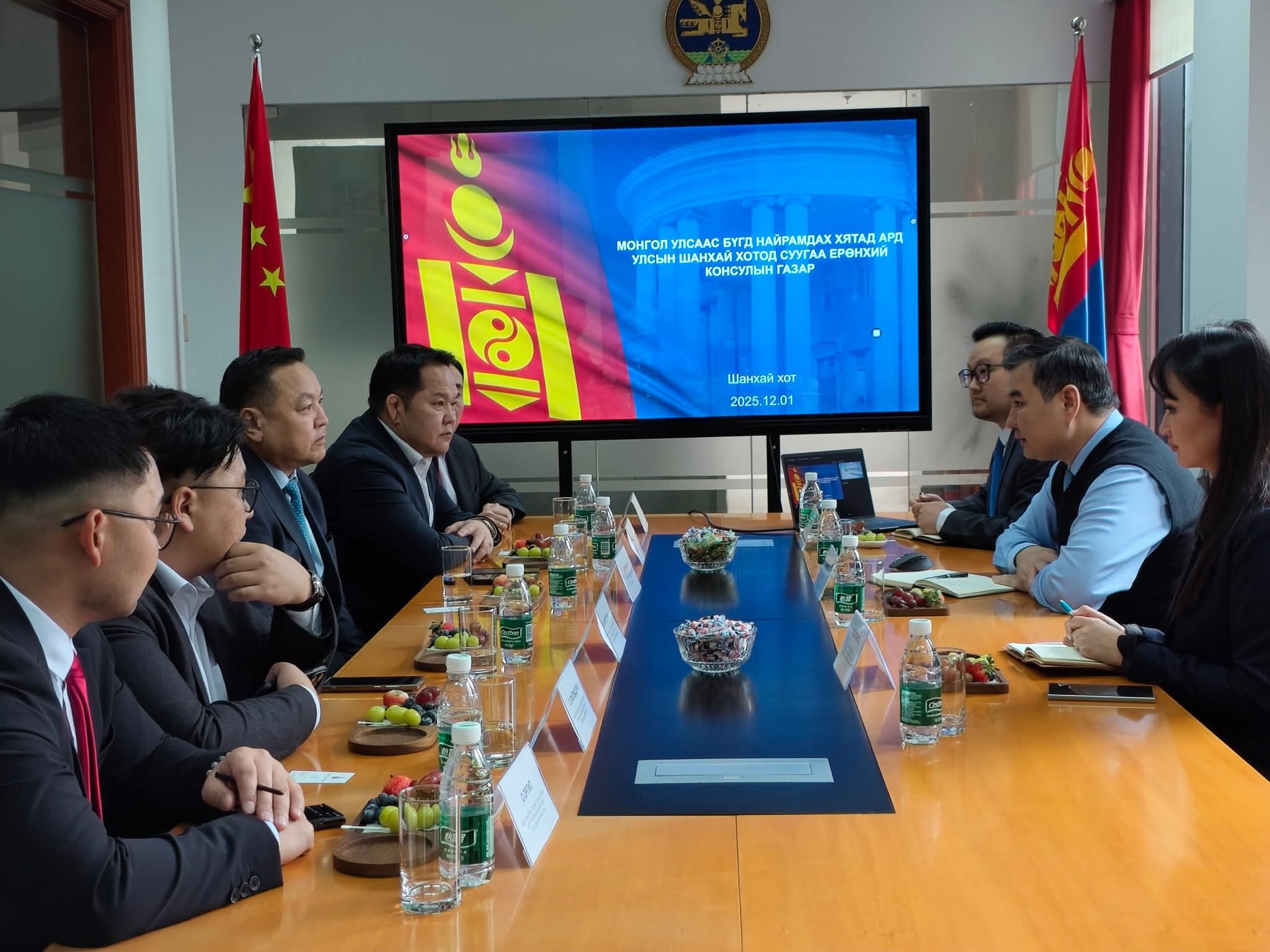 Монгол Улсын Засгийн газрын хэрэгжүүлэгч агентлаг Ашигт малтмал, газрын тосны газрын Орон нутаг дахь төлөөлөгчийн газрын дарга Д.Батмагнай тэргүүтэй төлөөлөгчид Шанхай хотноо зохион байгуулагдаж буй “Олон улсын уул уурхайн технологи, тоног төхөөрөмж болон Азийн ухаалаг уул уурхайн үзэсгэлэн”-д оролцох үеэр Ерөнхий консул Д.Болдын урилгаар 2025 оны 12 дугаар сарын 1-ний өдөр Шанхай хотод суугаа Ерөнхий консулын газартай танилцав.