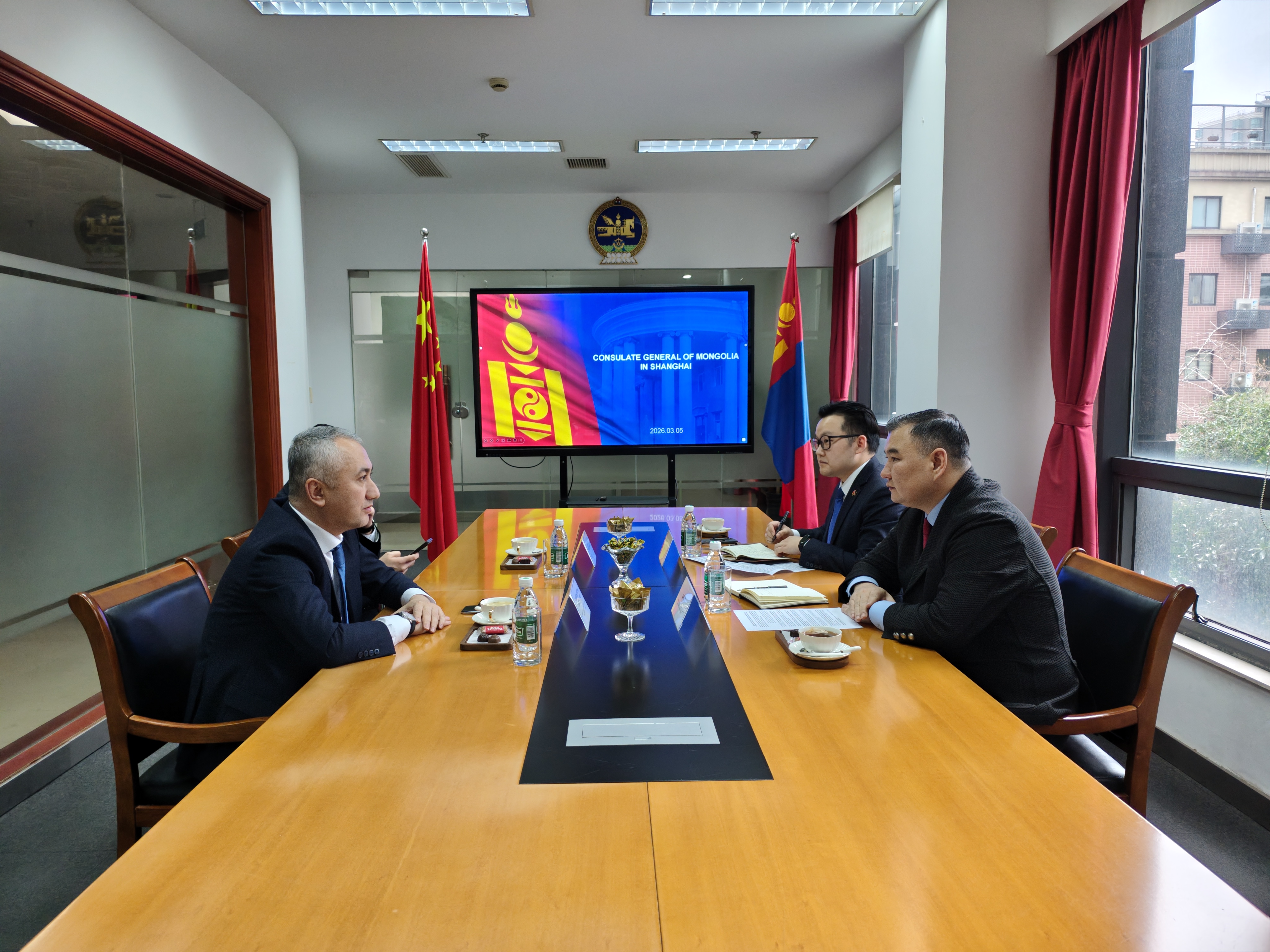 Монгол Улсаас БНХАУ-ын Шанхай хотод суугаа Ерөнхий консул Д.Болд 2026 оны 3 дугаар сарын 5-ны өдөр Бүгд Найрамдах Узбекистан Улсаас БНХАУ-ын Шанхай хотод ажиллахаар томилогдож үүрэгт ажилдаа орж буй Ерөнхий консул Исмаилов Рустам Сабиржанович-ийг хүсэлтээр нь хүлээн авч уулзав.